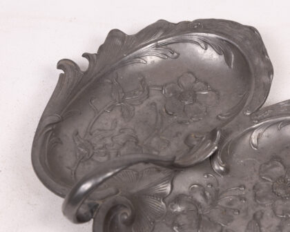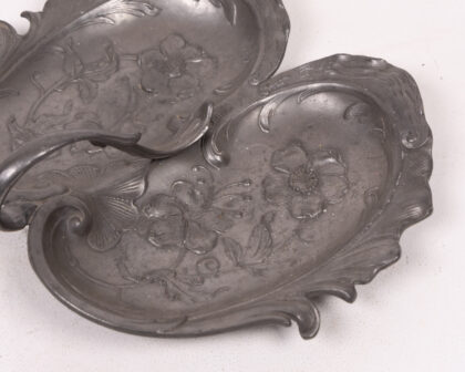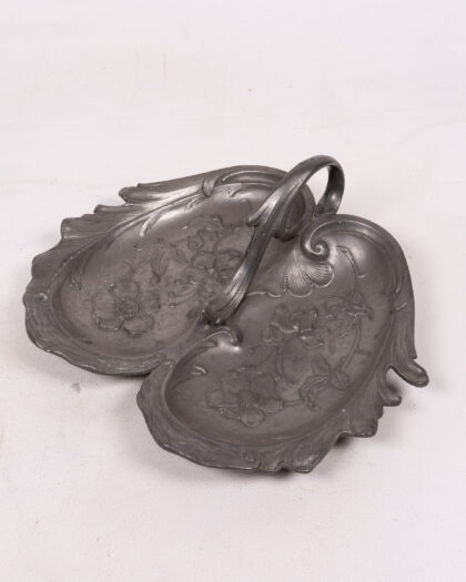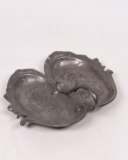 This is a decorative vintage pewter dish featuring two conjoined leaf-shaped sections, each adorned with engraved floral designs. A central handle connects the two sections. The dish features an ornate and stylized design, typical of early 20th-century metalwork. This piece exhibits a slightly aged appearance, adding to its vintage appeal. It would be an ideal piece for displaying trinkets, keys or other small items and would complement vintage or eclectic decor styles.