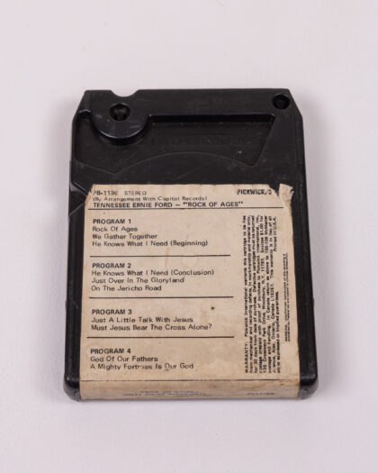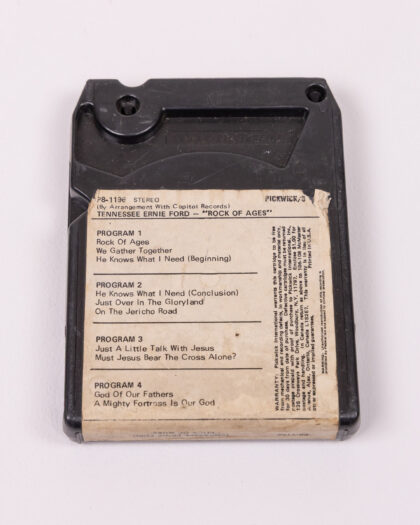 Vintage Pickwick 8-Track Tape featuring Tennessee Ernie Ford - "Rock of Ages." The tape is black with a label on the front featuring artwork and the song list. The back of the tape contains program information and warranty details. The tape shows signs of age and use.