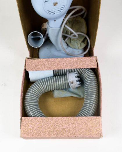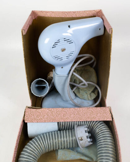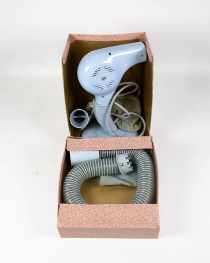 This is a vintage FIFO Princess hairdryer set with its original box and accessories. The set includes a pale blue plastic hairdryer, a hose, and a nozzle attachment, along with a fabric bag, all housed in the original two-part box. The box is decorated with a pink and gold floral pattern and features a red label. The hairdryer itself is a light blue plastic with a cream colored cord. The hose is ribbed and flexible. The set appears to be in good condition. A vintage hairdryer set like this could be displayed in a bedroom or dressing room as a nostalgic reminder of mid-century beauty routines.