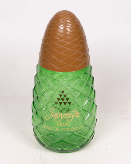 Shop Display Bottle. Vintage Pino Silvestre Vidal Eau de Cologne bottle in green glass. The bottle is designed in the shape of a pinecone with textured detailing. The bottle features the brand name 'Pino Silvestre' and 'Vidal Eau de Cologne' printed on the front. The lid is brown plastic, also textured to resemble a pinecone. The base of the bottle has the name 'Pino Silvestre' raised in the glass. The bottle is empty. Could be used as a decorative piece or a small vase.