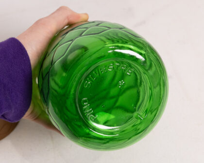 Shop Display bottle. Vintage Pino Silvestre Vidal Eau de Cologne bottle. Green glass pinecone design with brown lid. Collectible or decorative item.