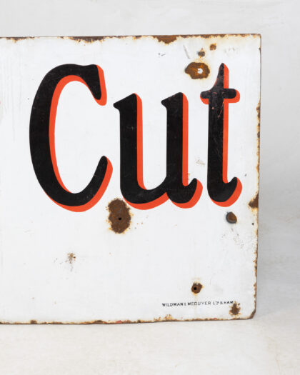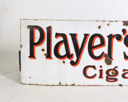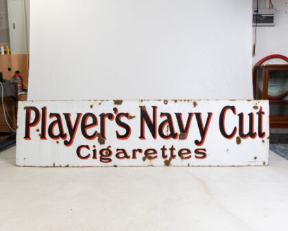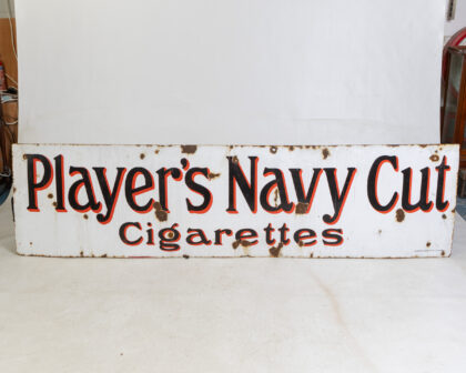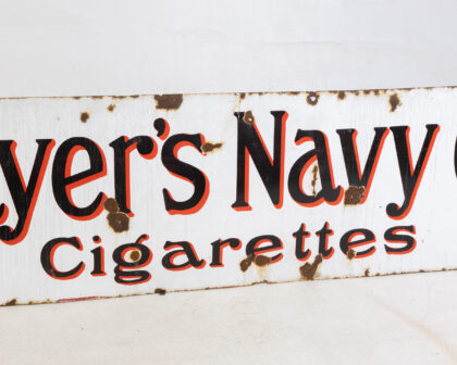 Vintage Player's Navy Cut Cigarettes enamel sign. Features red and black lettering on a white background. Shows wear and rust, adding to its vintage charm.