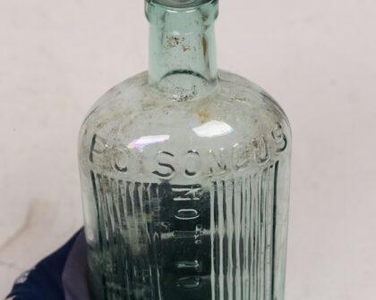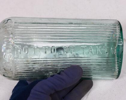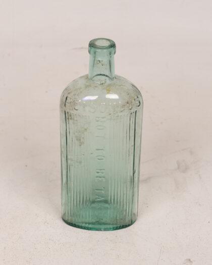 Vintage light green glass poison bottle with embossed "POISONOUS" and "NOT TO BE TAKEN" markings. A unique and collectible piece of vintage glassware.