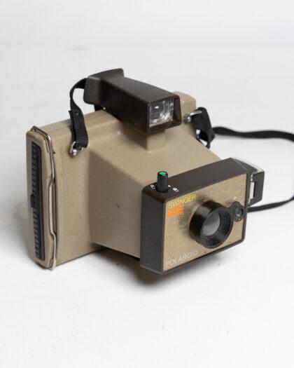 This vintage Polaroid Swinger EE camera is a classic instant film camera, ideal for collectors and photography enthusiasts. It features a unique design with a built-in flash and a vintage strap for easy carrying. The camera is in good condition with minor signs of wear, reflecting its age and history. Perfect for creating nostalgic instant photos or as a decorative piece.