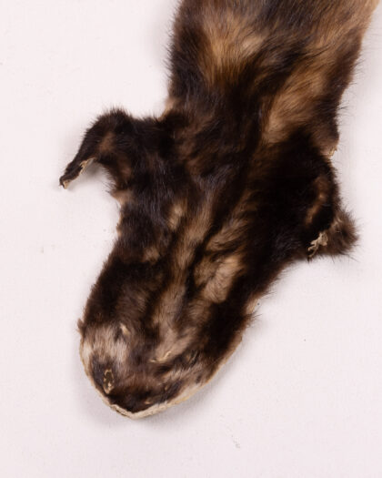 Vintage mink pelt with brown and black fur. Decorative item shows wear. Ideal for collectors or unique home decor.