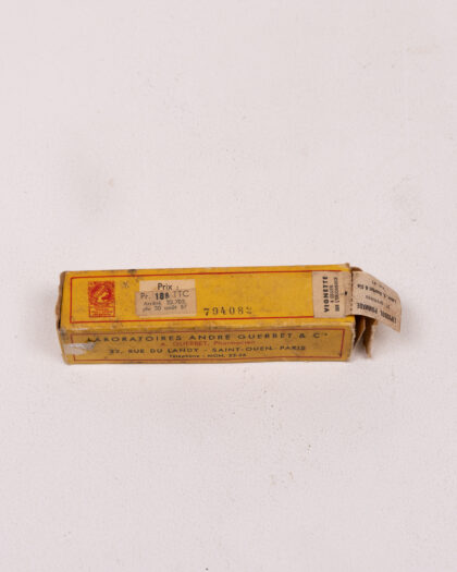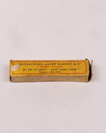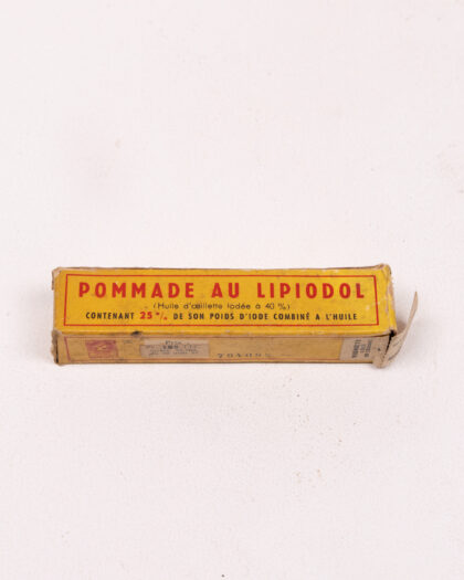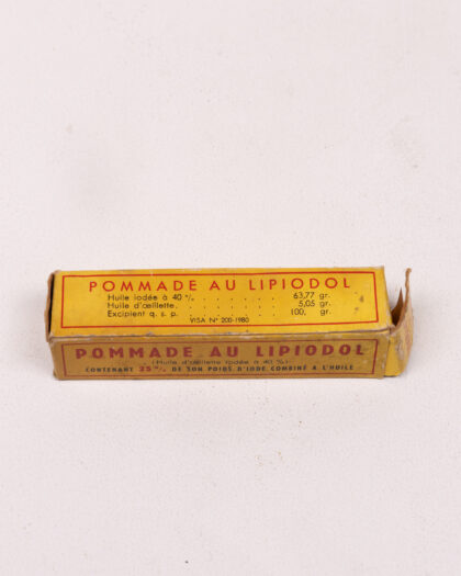 Vintage 'Pommade Au Lipiodol' iodine ointment in original paper box by Laboratoires André Guerbet & Cie, Paris. Shows wear.