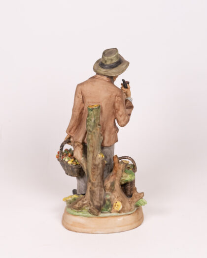 Vintage porcelain figurine of a man with a basket of fruit and pipe, hand-painted. Perfect gift for collectors and art enthusiasts.