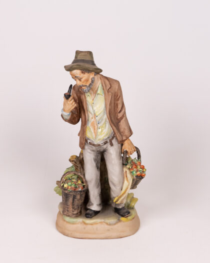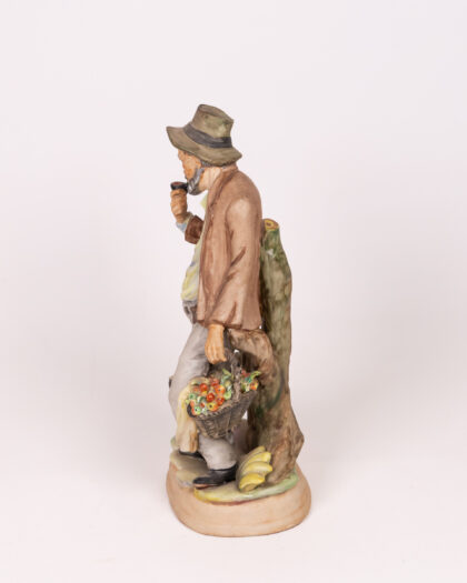 Vintage porcelain figurine of a man with a basket of fruit and a pipe. The figurine has been painted and depicts a man wearing a hat, brown jacket, beige shirt, grey trousers and black shoes. He is holding a pipe in one hand and a basket of fruit in the other. The base is oval. It appears to be in good condition.