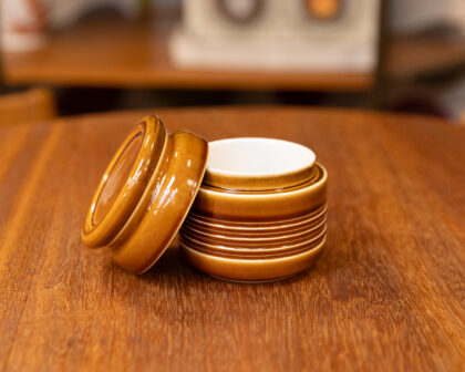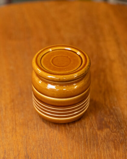 Discover the charm of this mid-century modern glazed ceramic honey jar. Featuring a warm amber hue and elegant ribbed detailing, its timeless design enhances any kitchen or dining space. This well-preserved piece is perfect for adding a touch of vintage flair to your home decor.