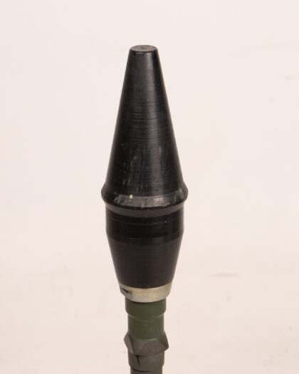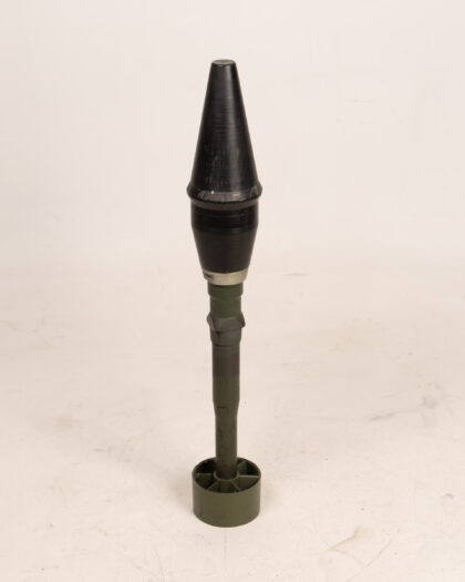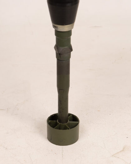 Vintage practice mortar round. Olive green cylindrical body with a black, conical warhead. Metal construction with some signs of wear and age, including minor scratches and discoloration. A collectible military item for display.