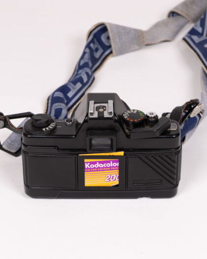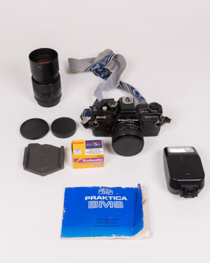 This Praktica BMS camera set includes the camera body, lens, lens cap, flash, lens extender, user manual, a partial roll of Kodak film, and a protective lens cover. The camera is black with silver accents and a grey camera strap. The set is in used condition, with some cosmetic wear visible on the camera body, lens, and accessories. The instruction manual shows its age. This is a perfect set for a camera collector or someone looking to get into vintage photography. Untested.