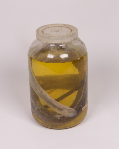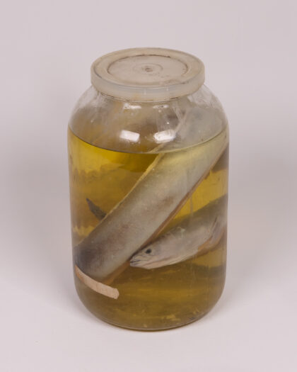 A preserved Eel specimen stored in a glass jar with a clear lid. The fish floats in a yellow liquid. The jar has a plain label affixed to the side. This is an unusual decorative piece, appealing to collectors of the strange and macabre. In good vintage condition.