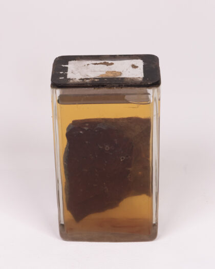 A vintage preserved with cirrhosis of the Liver specimen stored in a glass jar with a black lid. The specimen is a brown, biological sample, possibly a tissue sample or organ, preserved in a yellow-tinted liquid. The rectangular glass jar is sealed with a black metal lid, showing signs of age and wear. This intriguing item would be an oddity in a curiosity cabinet.