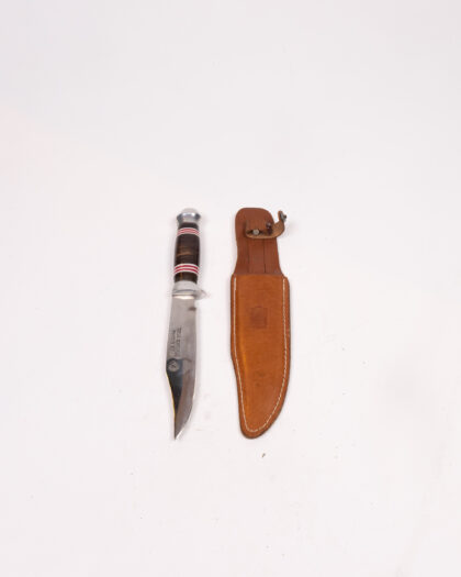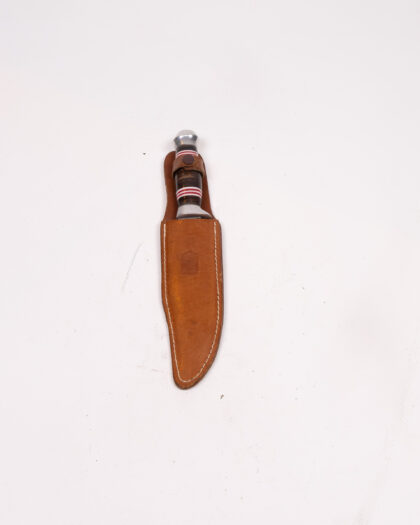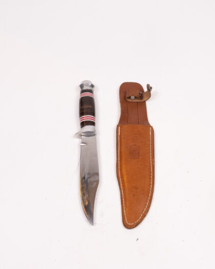 This is a vintage Puma knife, featuring a stainless steel blade and a handle made of wood and coloured rings. It comes with its original brown leather sheath, which is marked with the Puma logo. The knife shows signs of age and use, which are consistent with its age. There are a few scratches to the blade, and some wear on the leather sheath. The knife measures approximately 8 inches in overall length. The sheath has a belt loop for easy carrying. This is a great item for a knife collector or anyone who enjoys outdoor activities.