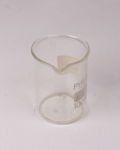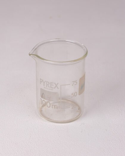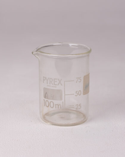 Authentic vintage Pyrex England 100ml glass lab beaker with white graduations. A unique piece of scientific history, perfect for quirky kitchenalia or home office decor.