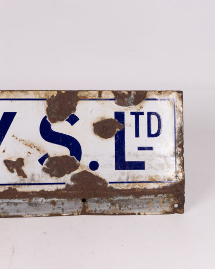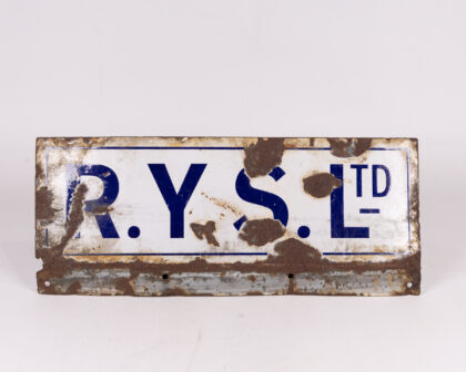 Authentic vintage enamel sign from R.Y.S.L Ltd. Features bold blue lettering on a white background. Perfect for collectors!