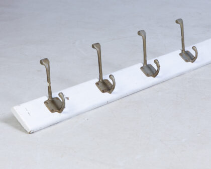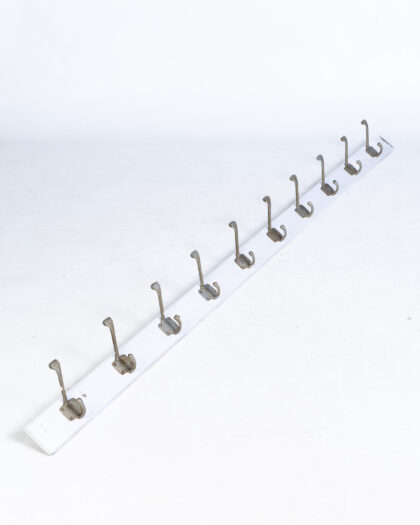 A white wooden coat rack featuring ten metal double coat hooks. Ideal for use in a hallway or porch to keep coats and hats tidy. The white paint has some wear and tear, and there are some rust marks on the hooks. However, it is still a very usable item with plenty of life left in it.
