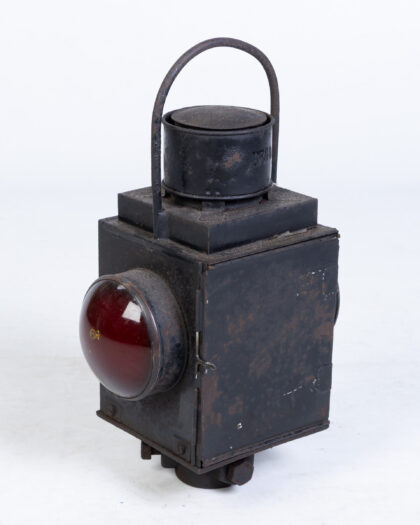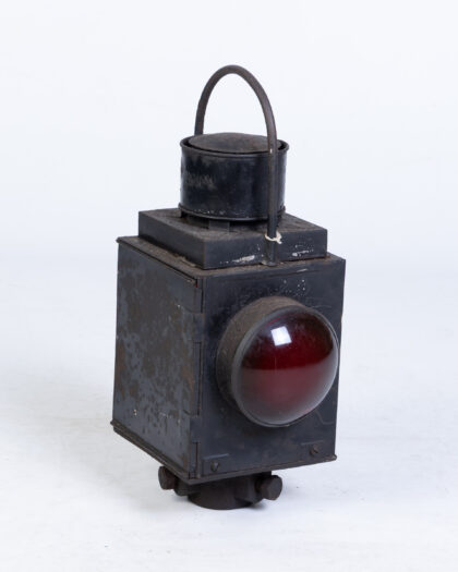 Vintage railway signal lamp with red lens. A unique piece of railway history, perfect for collectors or as a decorative item. Metal construction, black finish.