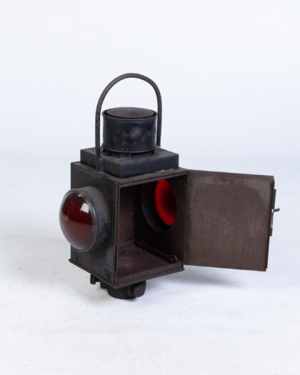 Vintage railway signal lamp featuring a robust metal construction, predominantly black with a prominent red lens. The lamp shows signs of age with surface rust and wear, adding to its authentic character. The hinged door opens to reveal the lamp's interior. A handle on top allows for easy carrying. This piece could be a decorative item or a unique lighting fixture.