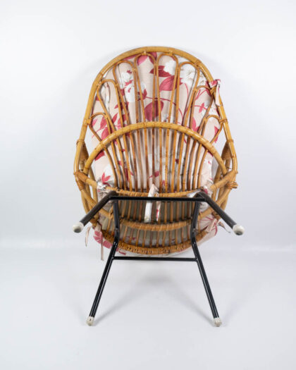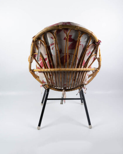 Vintage rattan armchair with metal legs and floral patterned cushions. Some wear to the rattan. Cushion ties are present. Solid seating.