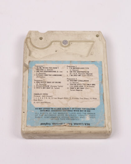 Vintage 1972 RCA Records 8-track cartridge featuring Charley Pride. The cartridge is made of white plastic with a blue label. The label details the songs on each of the four programs. The cartridge shows some signs of wear and age, including marks and discolouration to the plastic casing. Please note that it is untested.