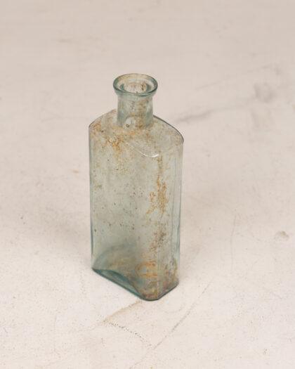 Antique rectangular glass bottle, featuring a narrow neck and gently rounded shoulders. The glass has a subtle blue tint. The bottle displays signs of age, including internal residue and external marks and imperfections, adding to its vintage character. Perfect for collectors or as a decorative piece. 13cm high