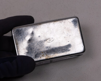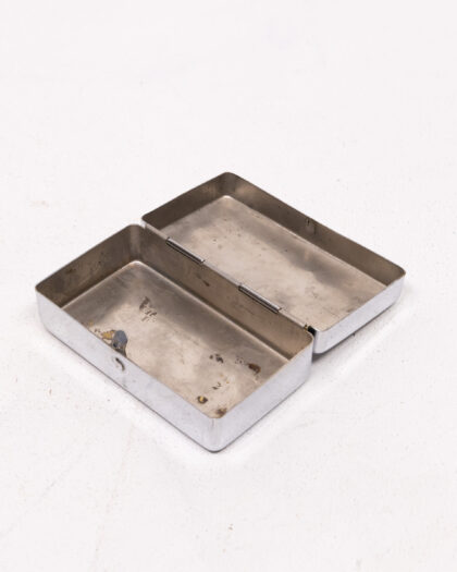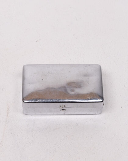 This is a vintage metal trinket box, likely from the mid-20th century. The box is made of a silver-toned metal, possibly chrome-plated. It features a rectangular shape with rounded edges and a hinged lid. The exterior has some tarnishing and wear consistent with age. The base has 'MADE IN ENGLAND' stamped on it. The interior is also tarnished but clean. A charming piece for storing jewellery or other small treasures.