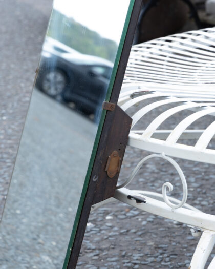 This is a rectangular unframed mirror, likely from the mid-20th century, with a plain glass surface. The back is constructed of solid wood, providing a sturdy and stable backing. The backing has an attached metal piece as it was likely a part of a vanity table. The mirror has a minimalist aesthetic due to its lack of a decorative frame. The condition of the mirror is good, although there may be minor imperfections associated with age.