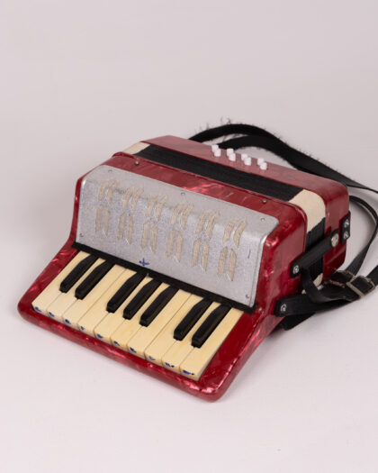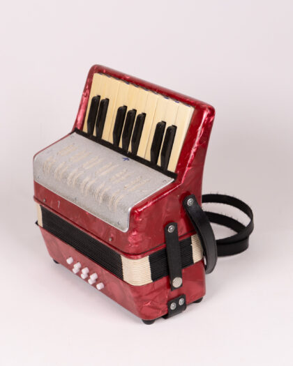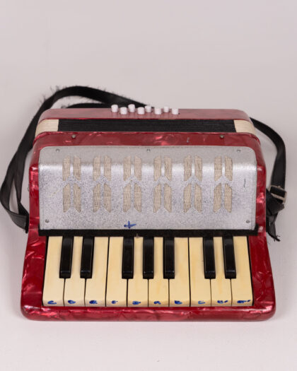 This is a vintage accordion in good condition. The accordion is red, with white and black keys. It has a silver grill over the bellows. The accordion has a shoulder strap for easy carrying. There are some minor signs of wear and tear commensurate with age, but overall it is in good condition and ready to play.