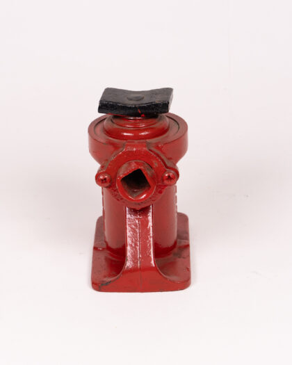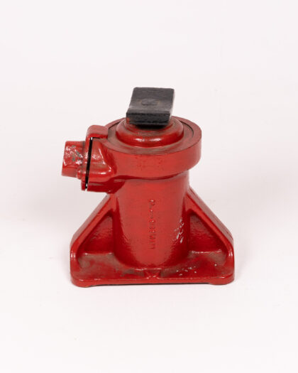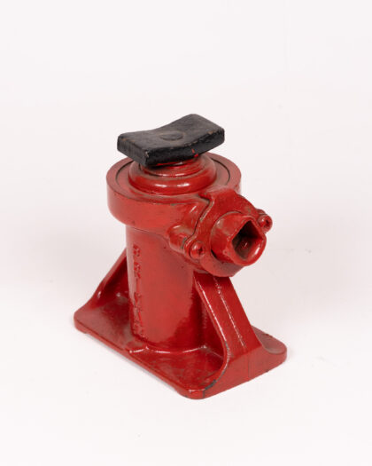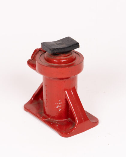 Vintage red bottle jack made of metal, great for vintage tool collectors or industrial-style home decor. Good condition.