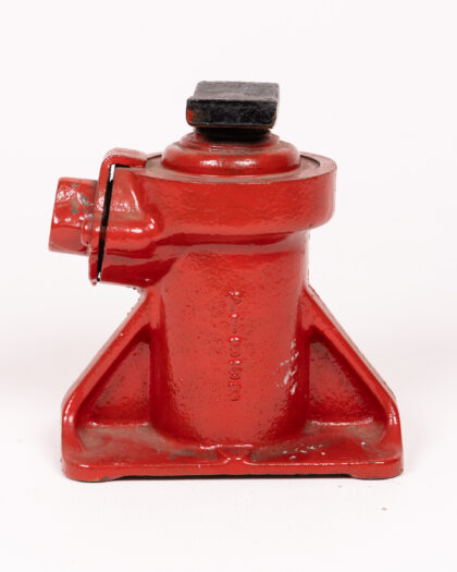 Vintage red bottle jack, constructed from heavy duty metal. This jack has a rectangular, black top section. It has been used and shows associated wear and tear to the red paintwork. It is ideal for collectors of vintage tools, or those looking for industrial home decor. Would look great on a shelf. Could still be used for mechanics.