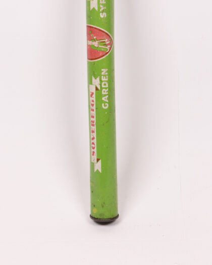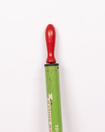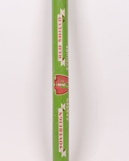 This is a vintage 'Red Shield' Sovereign Garden Syringe, finished in Green paint with Red handle. This antique garden tool would have been used to spray plants and crops. Features prominent 'Red Shield' branding with a logo of a regal figure. Good condition for its age, has some age related wear and tear to paintwork and handle.