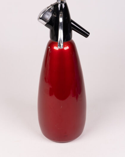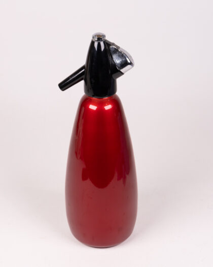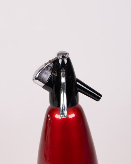 This is a vintage soda siphon. The body is a vibrant, metallic red, offering a pop of colour and retro aesthetic. The top is black with chrome detailing. It would make a great decorative piece for a home bar or kitchen or a wonderful addition to any vintage collection. It is in good condition for its age.