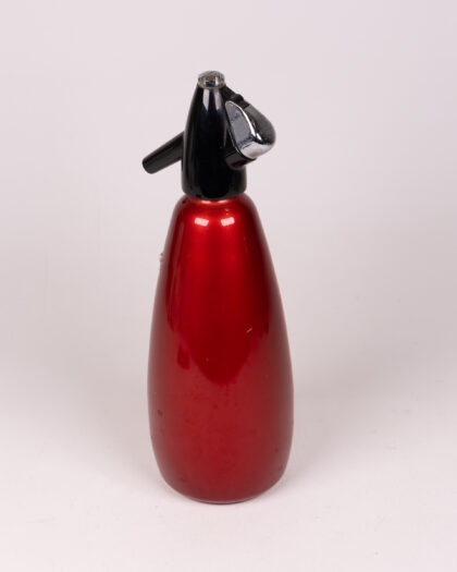 Vintage soda siphon in red with black and chrome head. A great retro barware item in good condition.