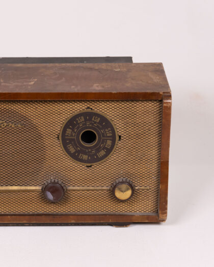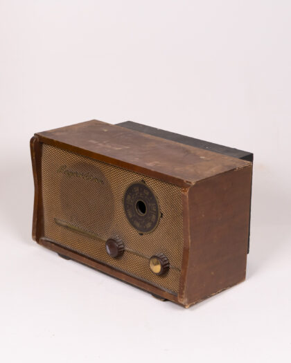 Vintage Regentone radio with wood cabinet and mesh speaker. Authentic retro design, showing wear consistent with age. Ideal for home decor.