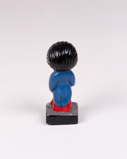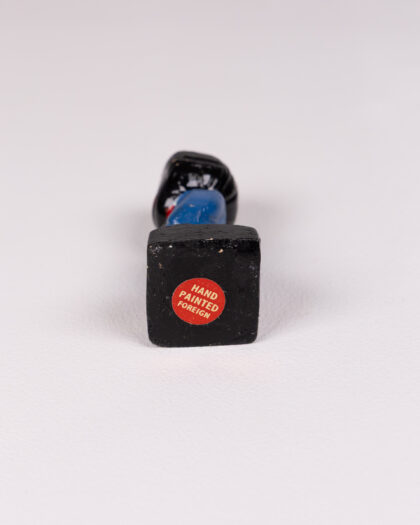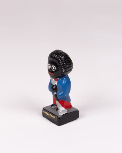 This is a vintage 'Robertson' Golly figurine made from plastic. The figure is in good condition and features the Golly wearing a blue jacket and red trousers. It is stood on a black base which has the word 'Robertson' in gold lettering. The underside has a 'Hand Painted Foreign' sticker attached.