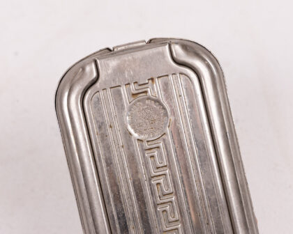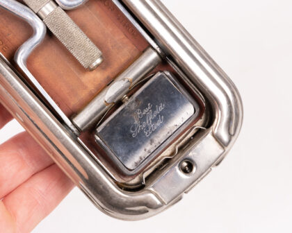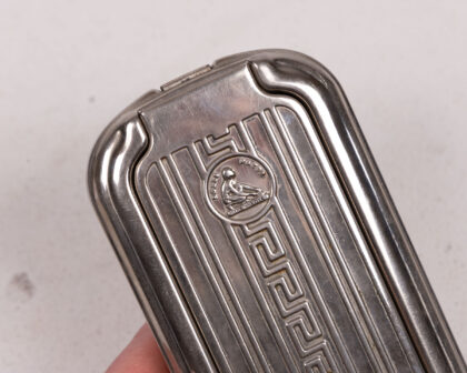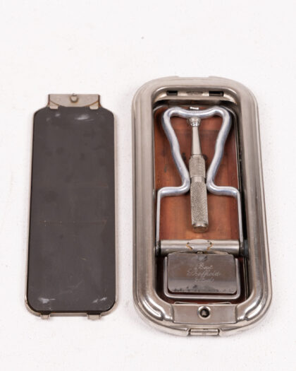 This is a vintage Rolls Razor, a self-contained shaving kit designed for travel and convenience. The case is made of metal, likely steel or chrome-plated steel, and features a decorative engine turned design on the lid, as well as the Rolls Razor logo. The interior houses the razor mechanism, a strop for sharpening the blade, and a honing stone for maintaining the edge. The condition is good for its age, with some signs of wear and use, including some scuffs and scratches on the case. The internal components are intact but may require some cleaning and lubrication to be fully functional. This vintage shaving kit is a great addition to any collection of grooming accessories or vintage travel items.
