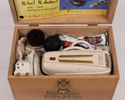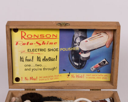 Vintage Ronson Roto-Shine Electric Shoe Polisher in a wooden box, complete with the original polisher and accessories. A unique gift idea!