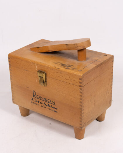This is a vintage Ronson Roto-Shine Electric Shoe Polisher. The polisher is housed in a wooden box with a hinged lid that opens to reveal the electric polisher, brushes and polish. The lid has a foot rest attached to the top. The box has a metal latch closure and four small wooden legs. The front of the box is marked with the Ronson Roto-Shine logo. The box shows some signs of wear, including scratches and scuffs to the wood, and tarnishing to the metal hardware. This item has not been tested, we cannot verify if it is working or not and is sold as a prop only.