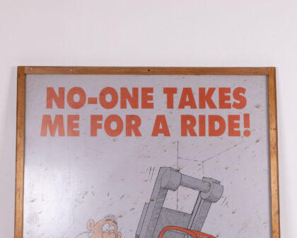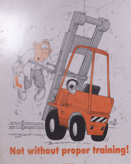 Vintage RoSPA training sign. Humorous cartoon of a forklift incident. Framed safety poster, perfect for collectors or unique decor.
