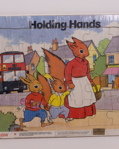 Vintage RoSPA (Royal Society for the Prevention of Accidents) 'Holding Hands' jigsaw puzzle for children. Encourages children to think about holding hands and road safety. Likely dates to the 1970s or 1980s. Puzzle is made of wood. Some slight damage to box, puzzle pieces are in good condition, though may have some slight marks due to age. Great vintage puzzle for any child.
