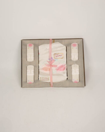 This is a vintage Ross Irish Rose tablecloth with four matching napkins, presented in its original box. The set features a delicate floral design, with pink roses and green leaves adorning a cream background. The tablecloth and napkins have a subtle lace trim. The box has a striped pattern. The set is in excellent vintage condition, appearing unused. Perfect for adding a touch of vintage charm to your dining table.