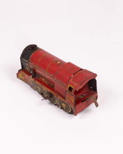 This vintage 'Royal Scot' tinplate locomotive is a charming collectible piece. The locomotive is marked with the number '7171' and 'Made in England'. The primary colours are red and black with some gold accents, with wear consistent with age and use. The body of the train shows surface scratches and paint loss in areas, adding to the vintage charm. This item would be a great addition to any collection of vintage toys or railway memorabilia.
