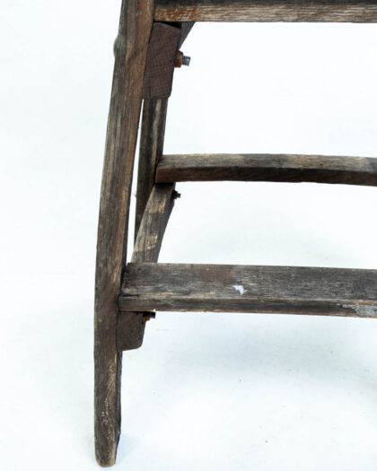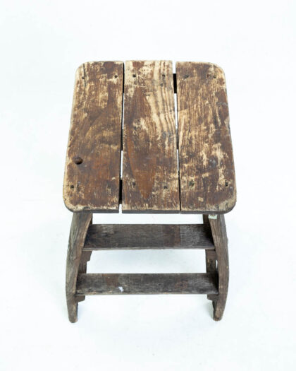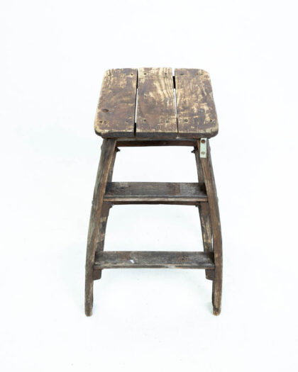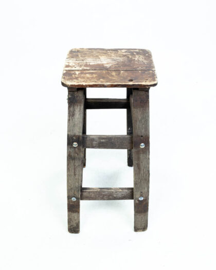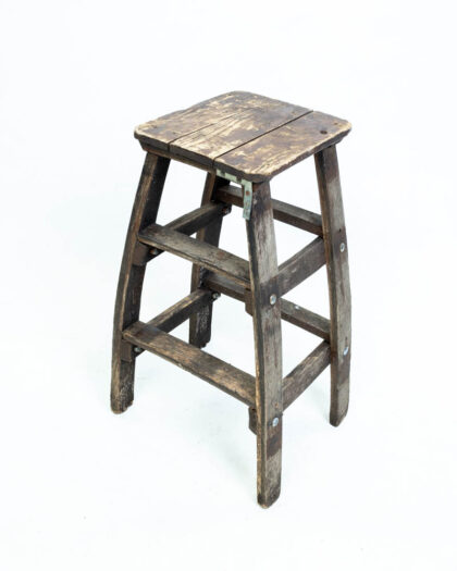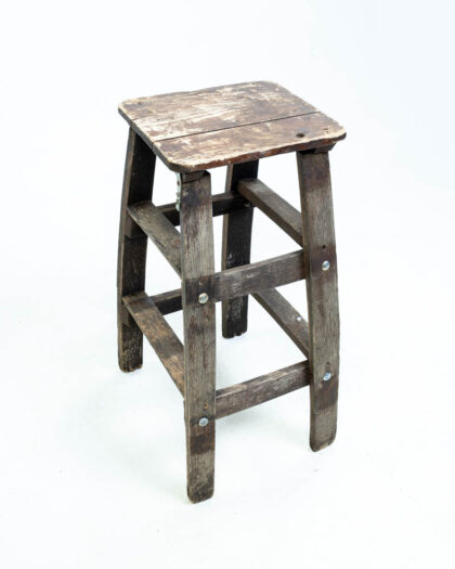 Rustic wooden barrel stool with a square seat. Shows age related wear to wood. Solid construction with metal brace supports. Distressed appearance.