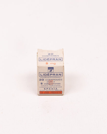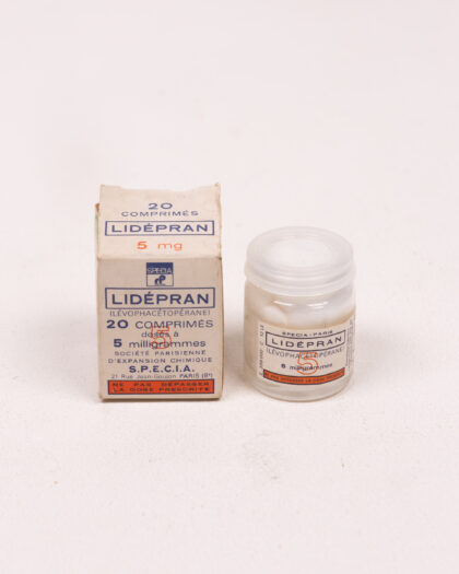 This is a vintage box and container for Lidèpran, a pharmaceutical product by S.P.E.C.I.A. The box is card with a blue and red label and the container is small clear plastic. The label on both contains the product name and dosage information. This item is a vintage medical collectable and would be great displayed in a home office or study. Please review all images for details on item condition.