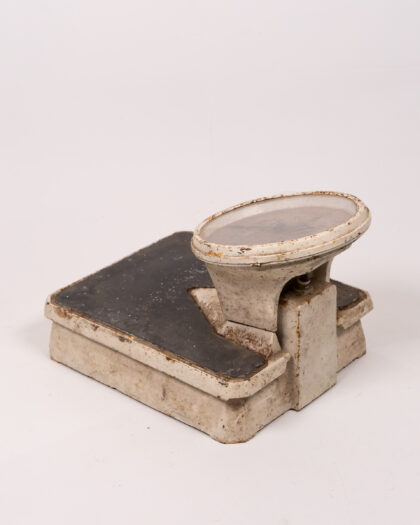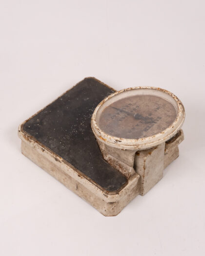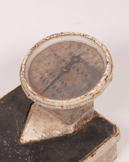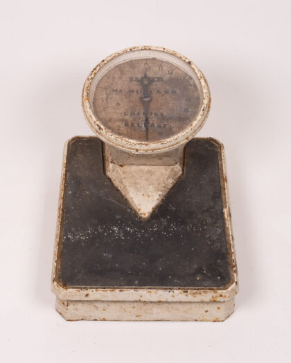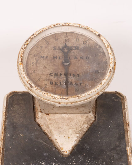 Vintage Salter Mc Muland Chemist Belfast scales. These scales feature a white painted metal base and a black weighing platform. The dial face is protected by glass, but is heavily aged. The dial displays weight measurements up to 20. This is an original vintage item with wear and rusting commensurate with age, the painted metal is chipped and peeling. This item is sold as seen and is not suitable for practical use. A wonderful decorative piece.