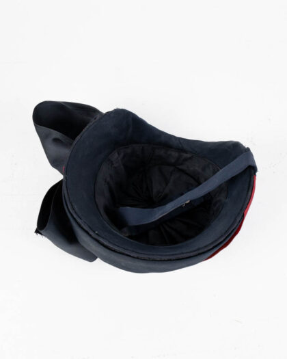 This vintage Salvation Army hat features a bonnet made of black fabric and straw. A dark navy ribbon is around the base and has a red strap with gold text that reads 'The Salvation Army'. The hat's construction is simple yet sturdy, reflecting the practical nature of the Salvation Army uniform. The hat is in great condition, showing minimal signs of wear. This piece would be great for collectors or anyone interested in vintage fashion and Salvation Army history.