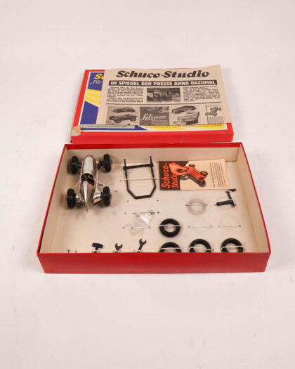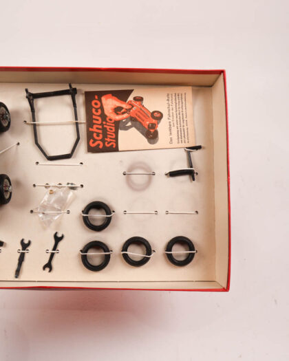 Vintage Schuco Studio Rennwagen-Monteur toy car set in original box with accessories. 1950s German collectable. Some wear to box. Model car included.