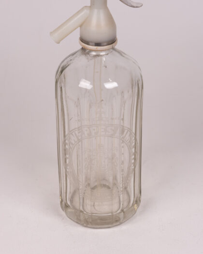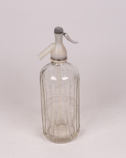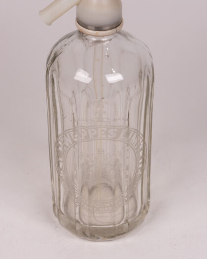 This is a vintage Schweppes soda siphon. The bottle is made from clear glass and is engraved with the Schweppes logo. The siphon mechanism appears to be made of metal and plastic. The bottle is in good condition with wear commensurate with age and use.