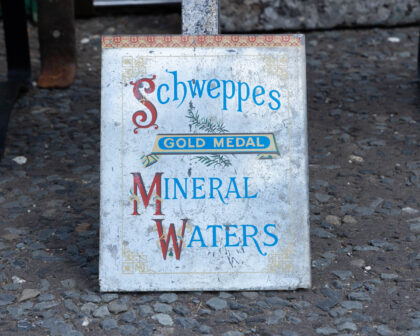Vintage Schweppes Mineral Waters unframed advertising mirror. 'Schweppes' is written in red and blue. 'Gold medal' is written on a gold banner. 'Mineral Waters' is written in blue and red. The mirror has a patterned border and some signs of wear and tear. This would look great in a retro themed bar or kitchen.